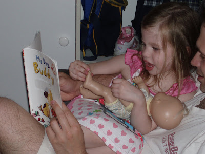 Last night, she went to bed in the pack 'n play around 8 PM. And slept until 4 AM! No 1 AM and 3 AM feedings like usual. I was thrilled. I fed her and put her back down and she promptly fell back asleep. Then at 4:30 I could hear Kaitlyn sobbing in her room. She was standing in the middle of her room, shaking like a leaf, and I could not get her back into her bed. She said she had lots of bad dreams and could not sleep in her room. So my only choice was to take her to our bed.